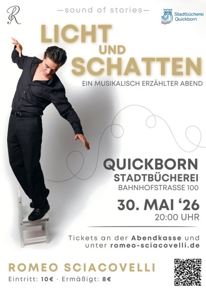 Tickets erhalten Sie online über Eventim: https://www.eventim.de/event/licht-und-schatten-stadtbuecherei-quickborn-21269763/?affiliate=GMD oder an der Abendkasse für 10 € bzw. ermäßigt für 8 € (Schüler/innen, Student/innen).