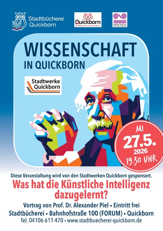 Am Mittwoch, den 27.05.2026 findet um 19:30 Uhr in Kooperation mit der Universitätsgesellschaft Schleswig-Holstein und der Stadt Quickborn ein Vortrag im Rahmen der Vortragsreihe "Wissenschaft in Quickborn" in der Stadtbücherei statt.