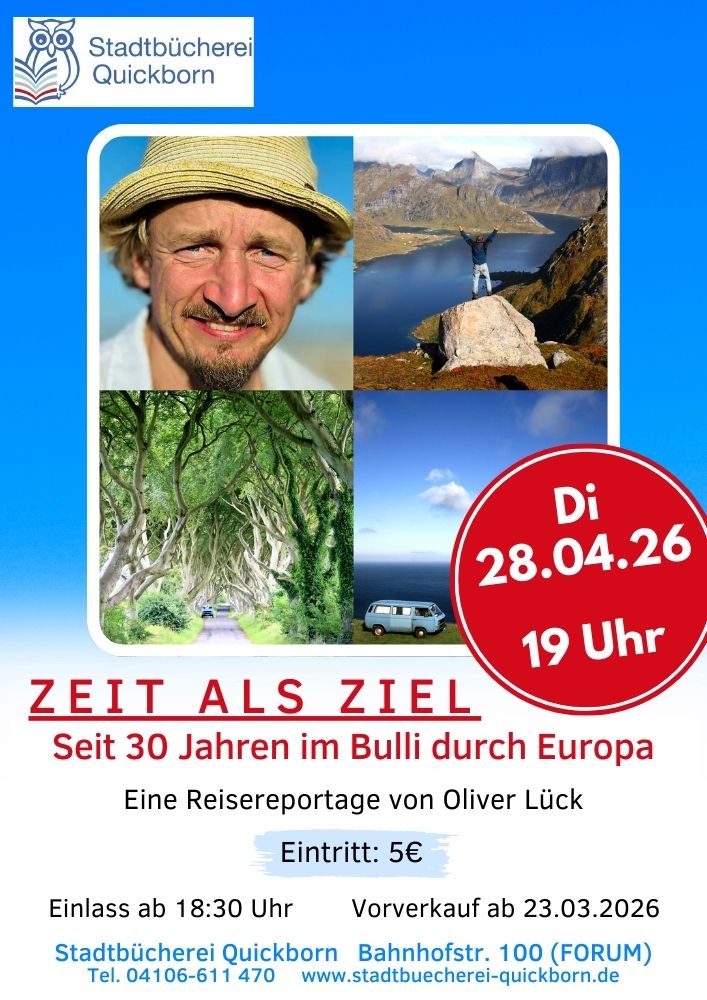 In den letzten Jahren waren es über 800 Abende, an denen Oliver Lück sein Publikum mit auf die Reise nahm. Am Dienstag, den 28 April 2026 kommt er nun in die Stadtbücherei Quickborn (Einlass: 18:30 Uhr, Beginn: 19 Uhr, Eintritt: 5€). Die Vorfreude ist riesig, den reisenden Geschichtensammler endlich bei uns begrüßen zu können!